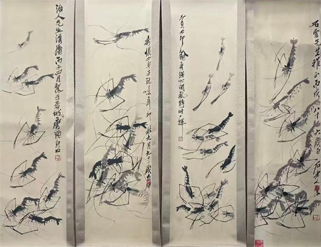齐白石虾四条屏简介:创作年代:晚年成熟期,是其画虾“三变”后臻于化境的结晶, 材质形制:纸本水墨立轴四条屏,全套四屏,可分可合、相映成趣。题材寓意:以水中群虾为主体,聚散动静、疏密有致,象征生机盎然、清雅高洁,兼具文人意趣与民间烟火气