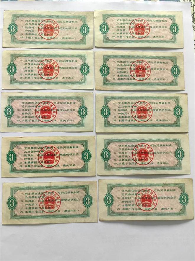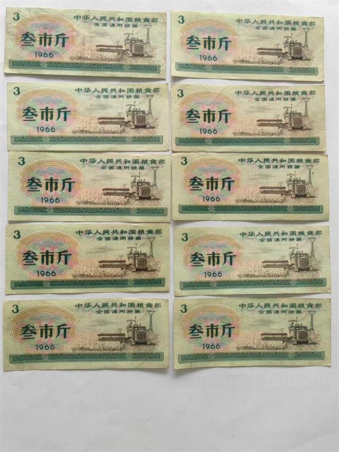 一组十张,1966年版叁市斤全国通用粮票,票面设计包含农业机械图案(体现“农业现代化”的时代导向),同时带有“中华人民共和国粮食部”标识及面额、年份信息,是计划经济时期粮食定量配给制度的典型载体。