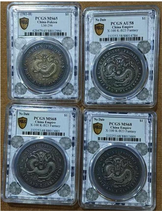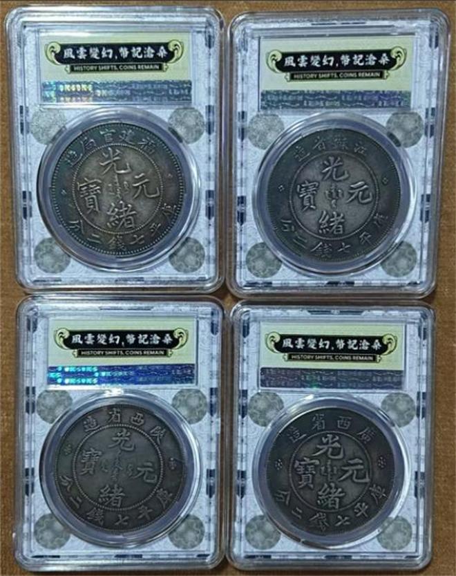 清代光绪元宝银元 这四枚分别是 “福建官局造”、“江苏省造”、“陕西省造” 和 “广西省造” 的 “光绪元宝库平七钱二分” 银币清代各省为了应对流通需求,纷纷开设造币厂铸造银元。“库平七钱二分” 是清朝的标准重量单位,相当于一元的面值
