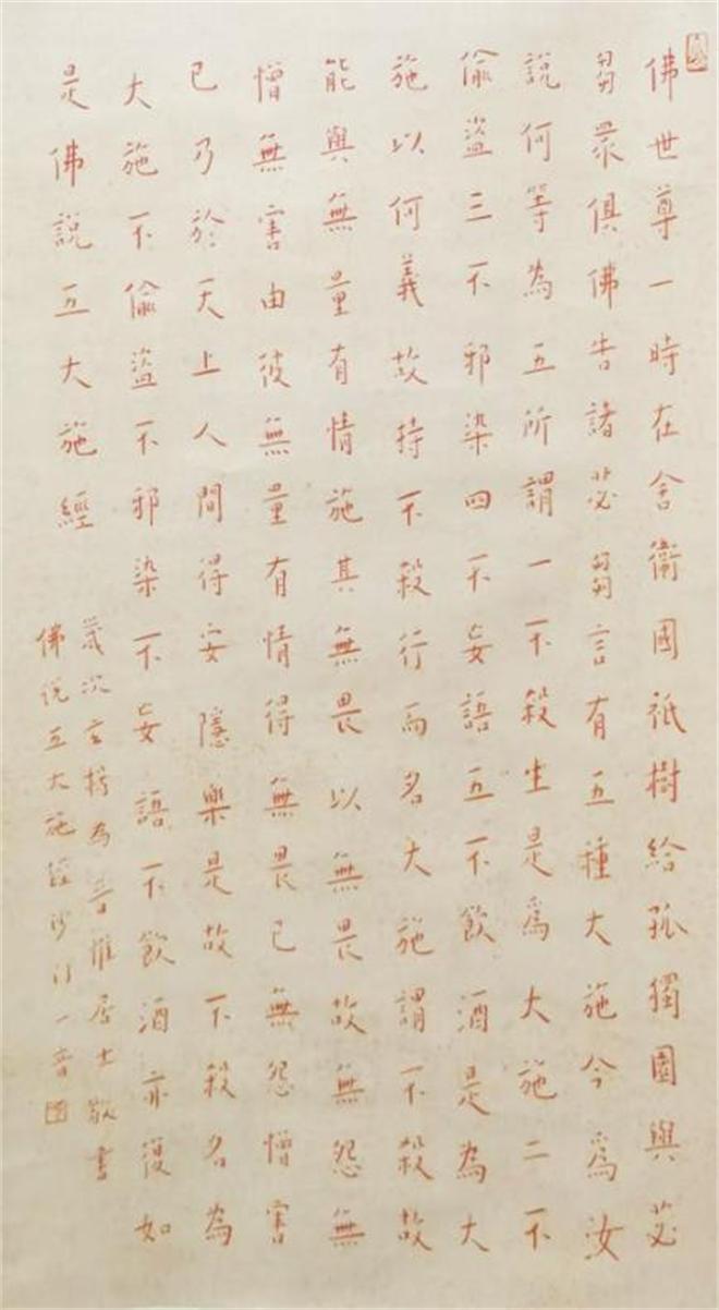 弘一法师对《佛说五大施经》颇为重视,不同时期因不同因缘多次书写此经。比如 1921 年他曾手写该经交付穆藕初居士影印流通,1932 年不仅在慈溪伏龙寺绘《罗汉长卷》时,于卷后以朱砂书写此经,还在当月另外书写了立轴四幅的《佛说五大施经》。这幅朱砂书写的作品和长卷中 100 位朱砂绘成的罗汉形象相呼应,后经多位专家考证为真迹,成为其朱砂书写佛经的代表性作品之一