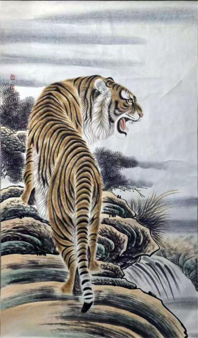 王建民是 “中国画虎第一村” 河南民权县王公庄村的代表画家之一,被誉为 “四大虎王” 之一。王建民的虎画通常构图自然,注重营造意境,善于通过细腻的笔触和巧妙的用色,将老虎的神韵展现得淋漓尽致。他画中的老虎,既有凛凛的王者之风,又有温温的和谐之气,从髭须、皮毛的渲染上,从草木、山崖的勾勒上,都十分劲健放达,和谐自然。