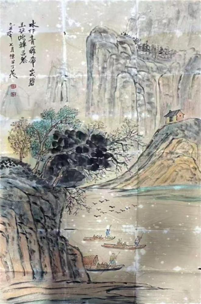 陈半丁此幅《山水》,以浅绛设色绘江峡秋韵,笔意苍润兼融海派秀雅与文人意趣。画中山石皴擦朴茂,江帆飞鸟灵动,题句“水作青罗带,山如碧玉簪”呼应清逸景致,兼具笔墨功力与诗意,是其典型的文人山水精品。
