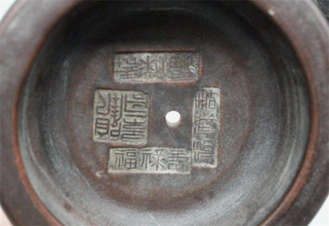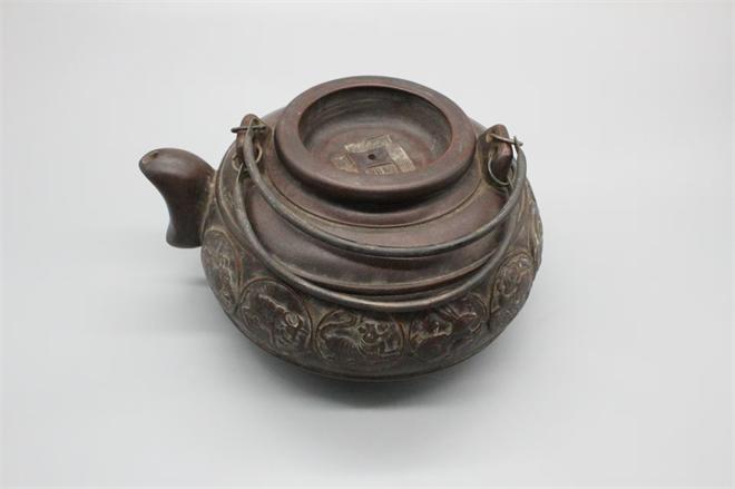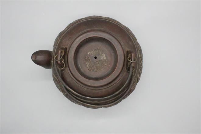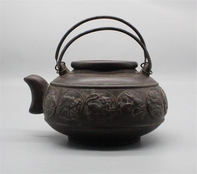 顾景舟款紫砂十二生肖提梁壶,壶身一周以浮雕团纹形式,完整呈现十二生肖图案,造型生动,细节饱满。壶底方形印章与壶盖内[福禄寿]等四方印款,是民国紫砂壶常见的落款形式,深褐色的包浆温润厚重,是岁月沉淀的痕迹,顾景舟近现代紫砂壶大家的早期作品,具有很高的收藏价值。